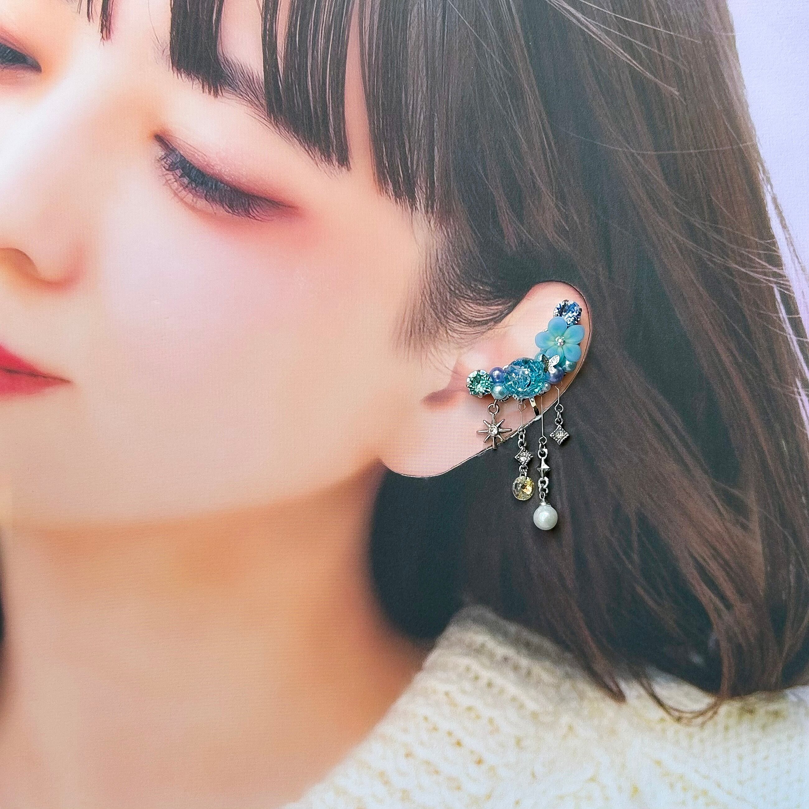 クリスタルドームビジュー♥クレイフラワーのイヤーカフ(ローズ/水色・ターコイズ)