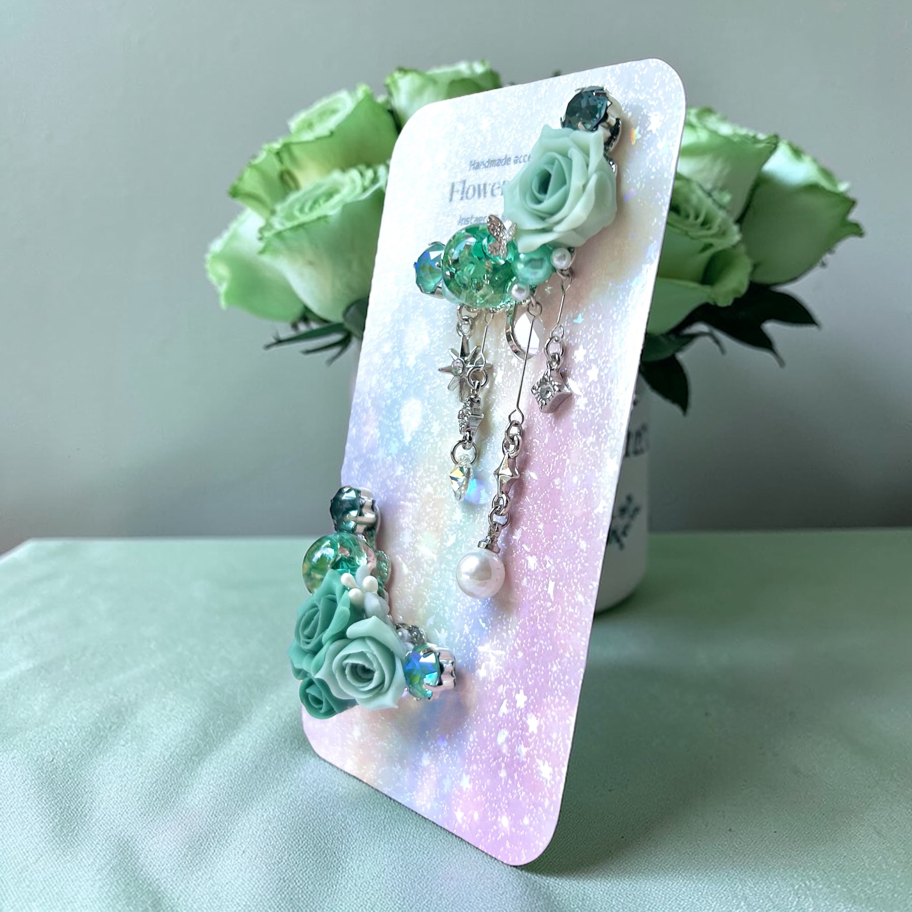 クリスタルドームビジュー♥クレイフラワーのイヤーカフ(ローズ/グリーン)