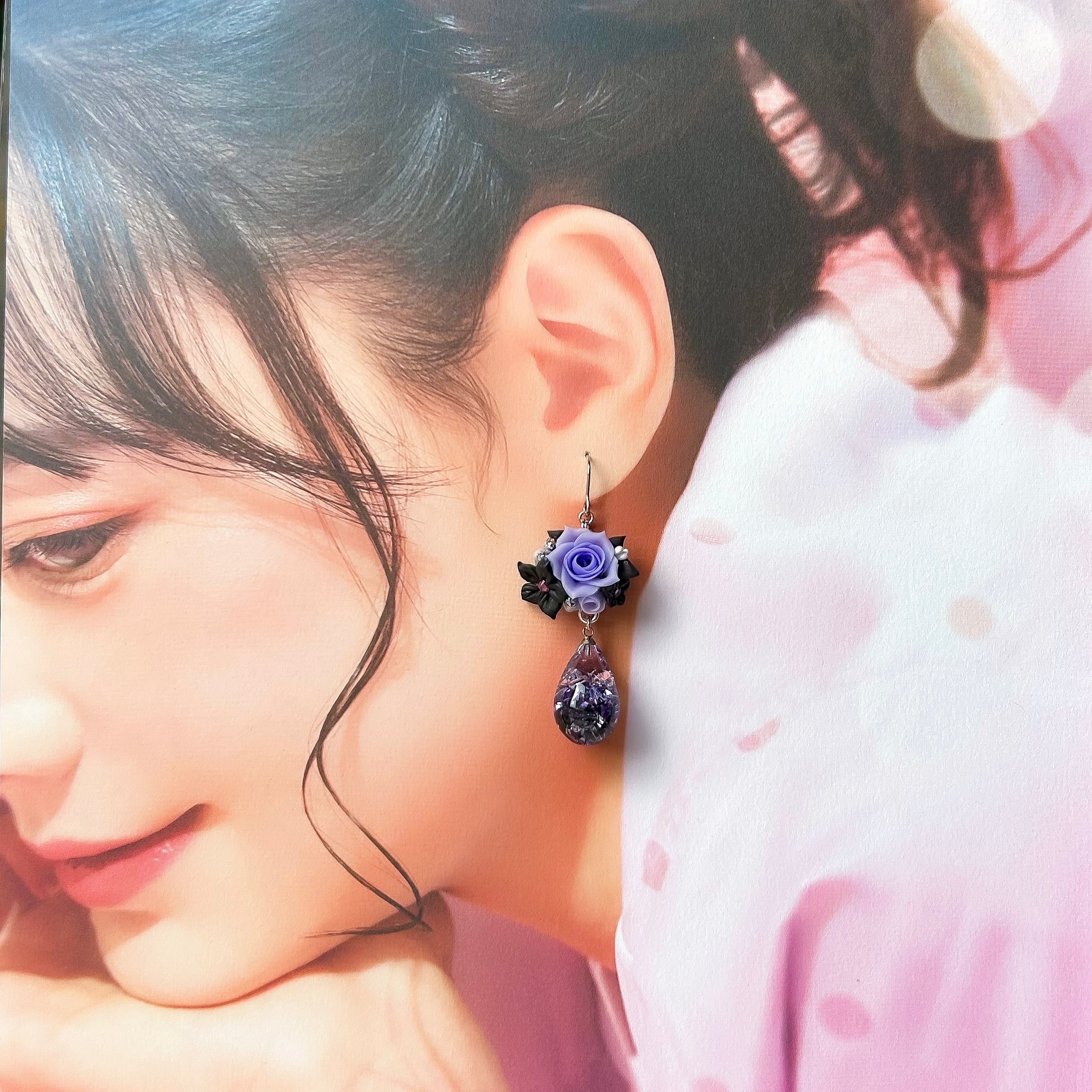 煌めくしずく♥クレイフラワーの耳飾り(ローズ/パープル・ブラック)