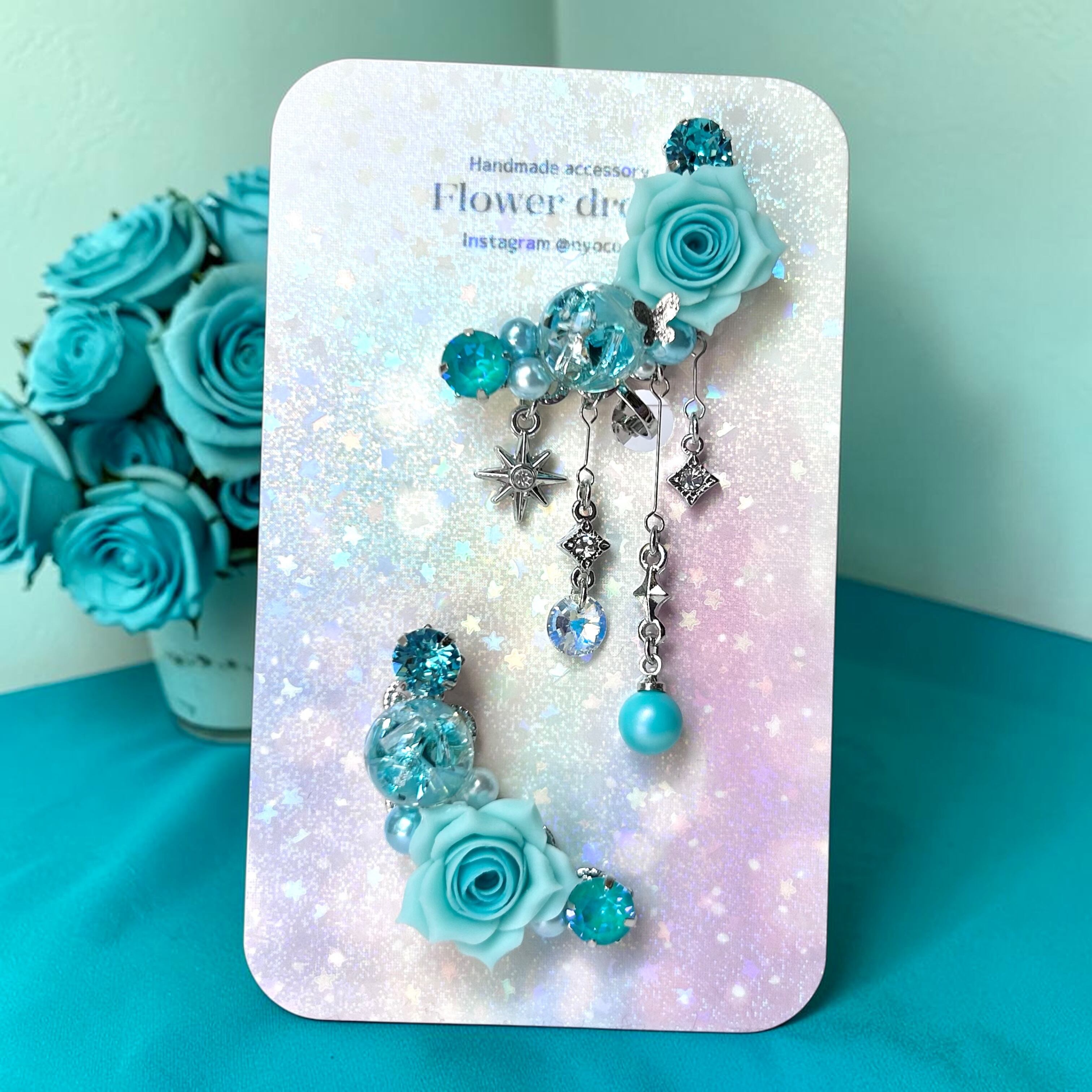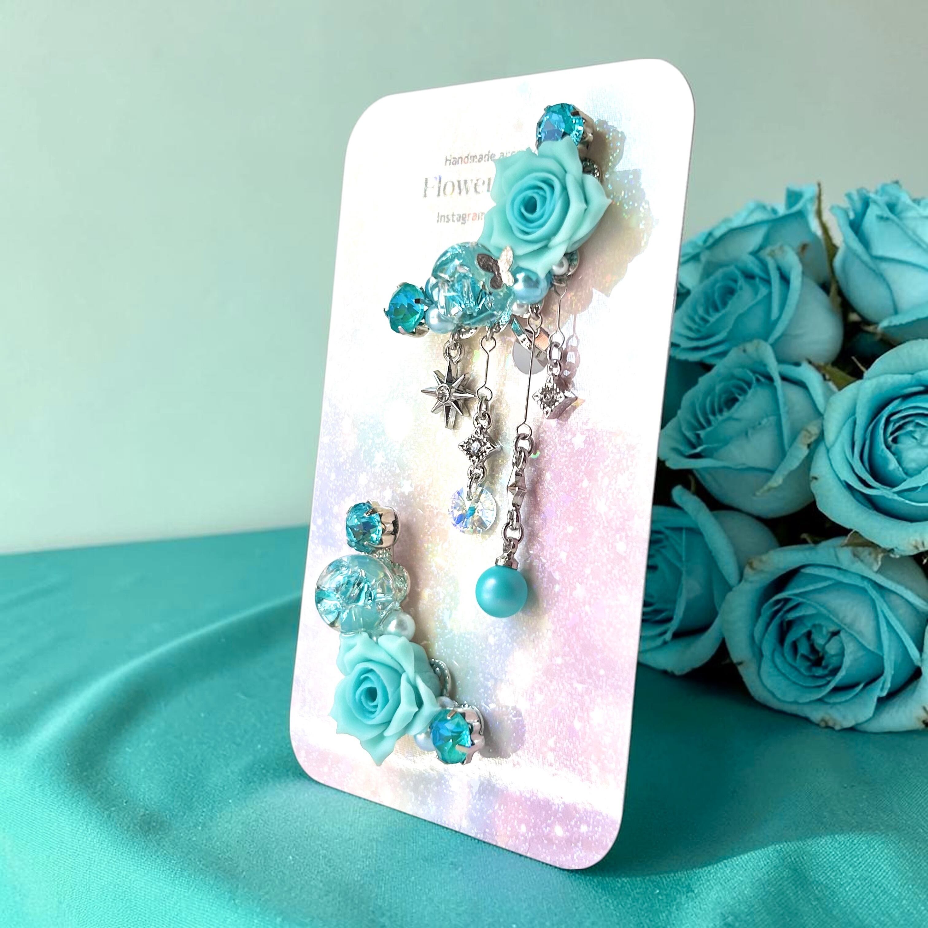 華やかなビジューデザインが魅力のハンドメイドイヤーカフ2点セットです。樹脂粘土パーツやスワロフスキー・クリスタルのダイヤカットストーン、パール、オリジナルのレジンパーツを贅沢に組み合わせ、耳元をエレガントに彩ります。