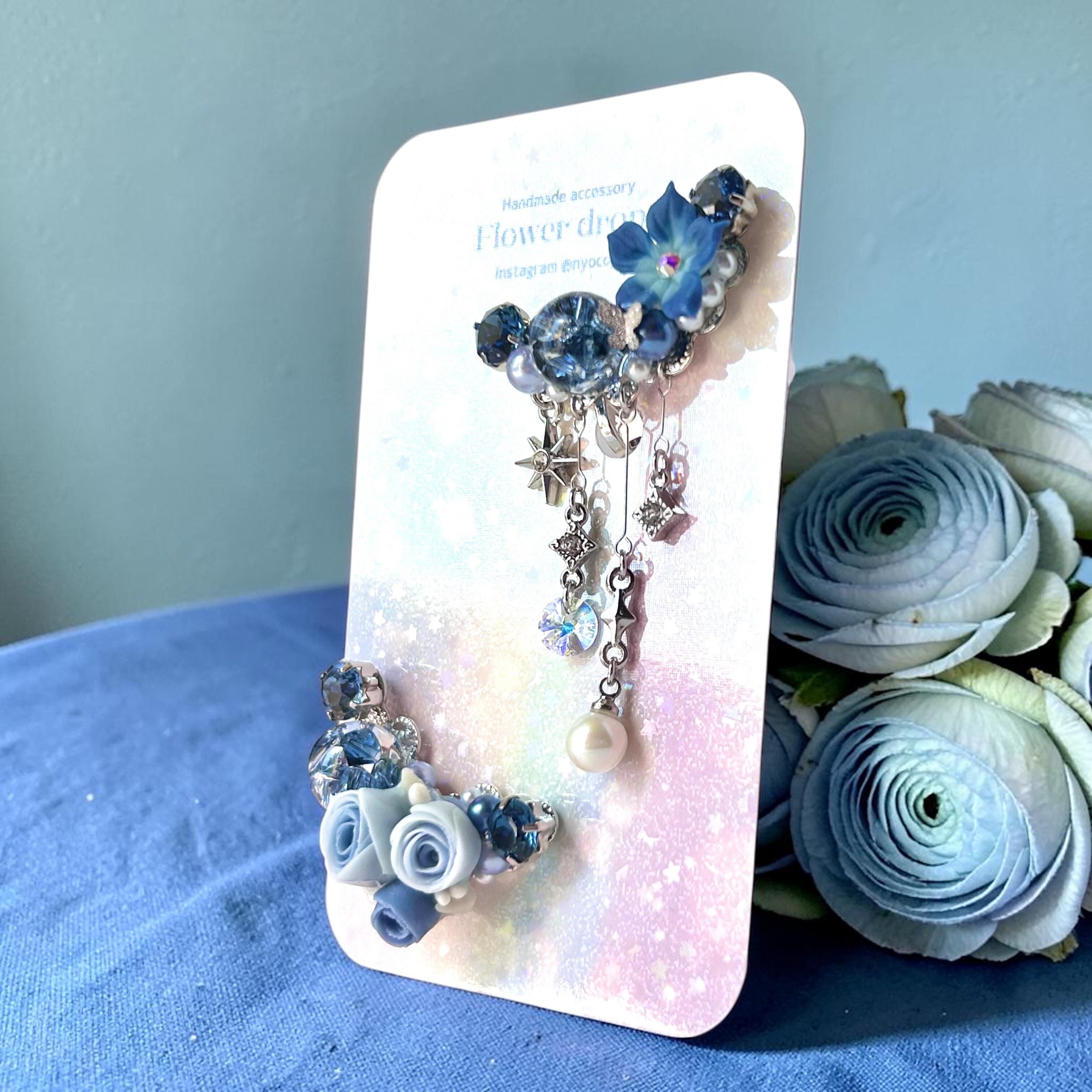 クリスタルドームビジュー♥クレイフラワーのイヤーカフ(ラナンキュラス/デニムブルー)