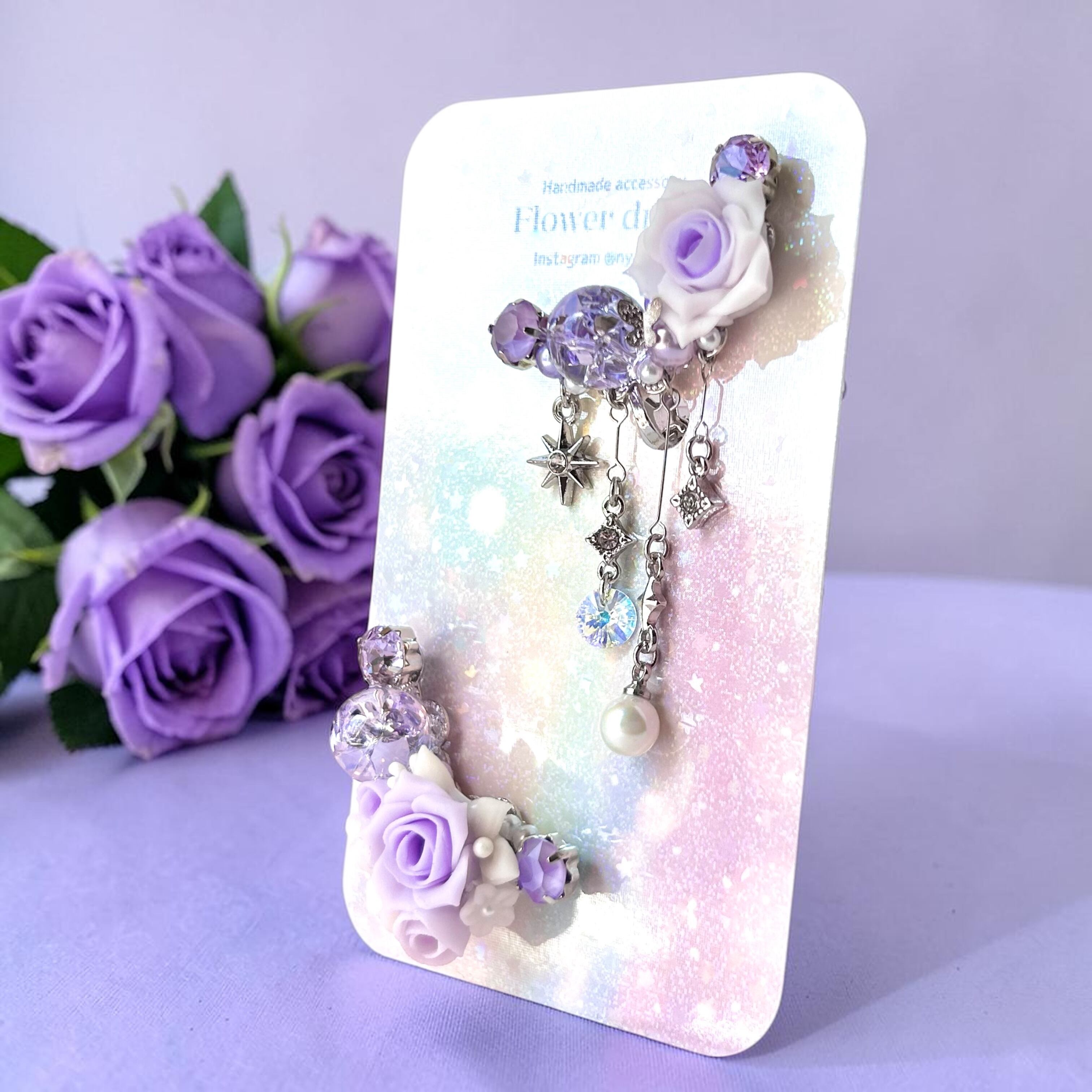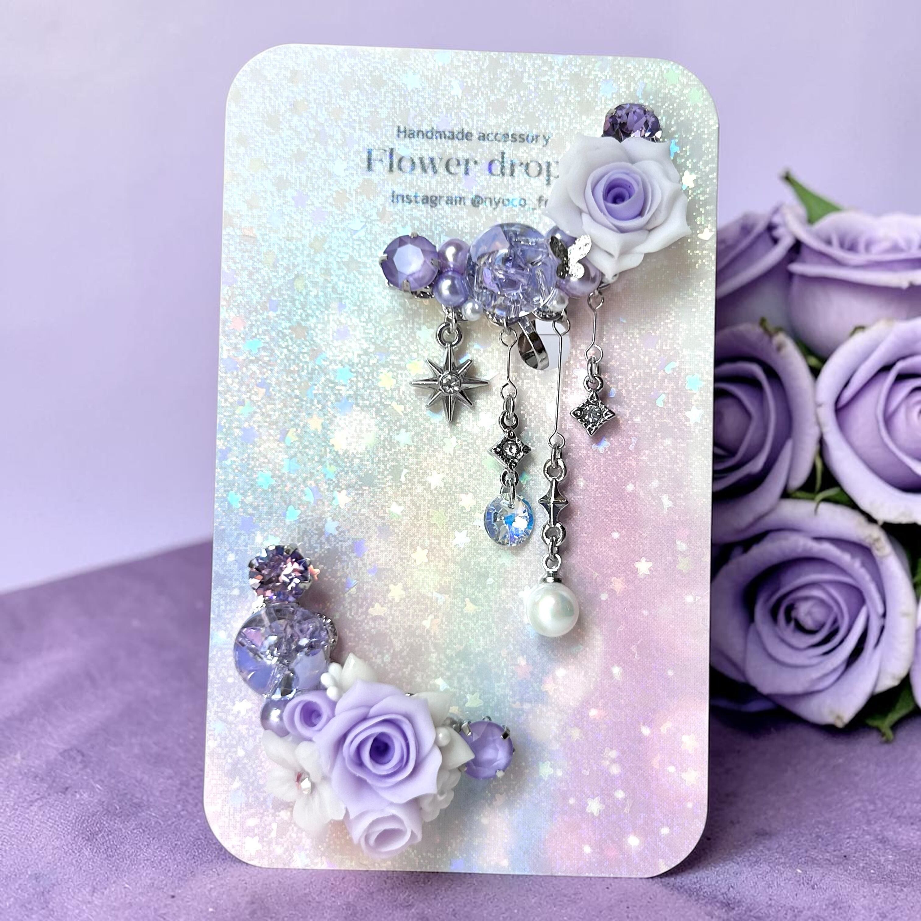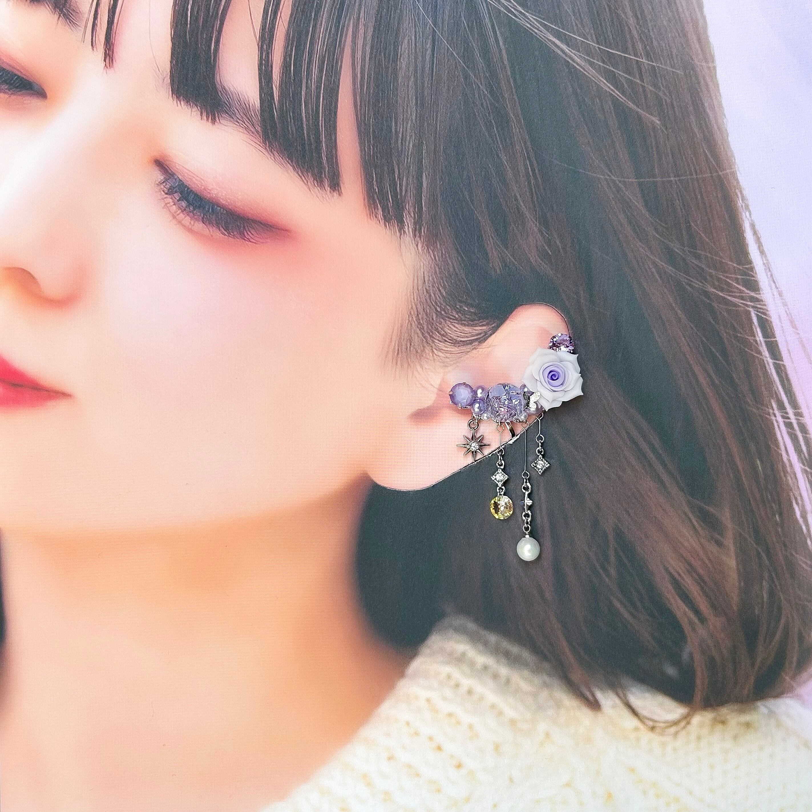 クリスタルドームビジュー♥クレイフラワーのイヤーカフ(ローズ/パープル)