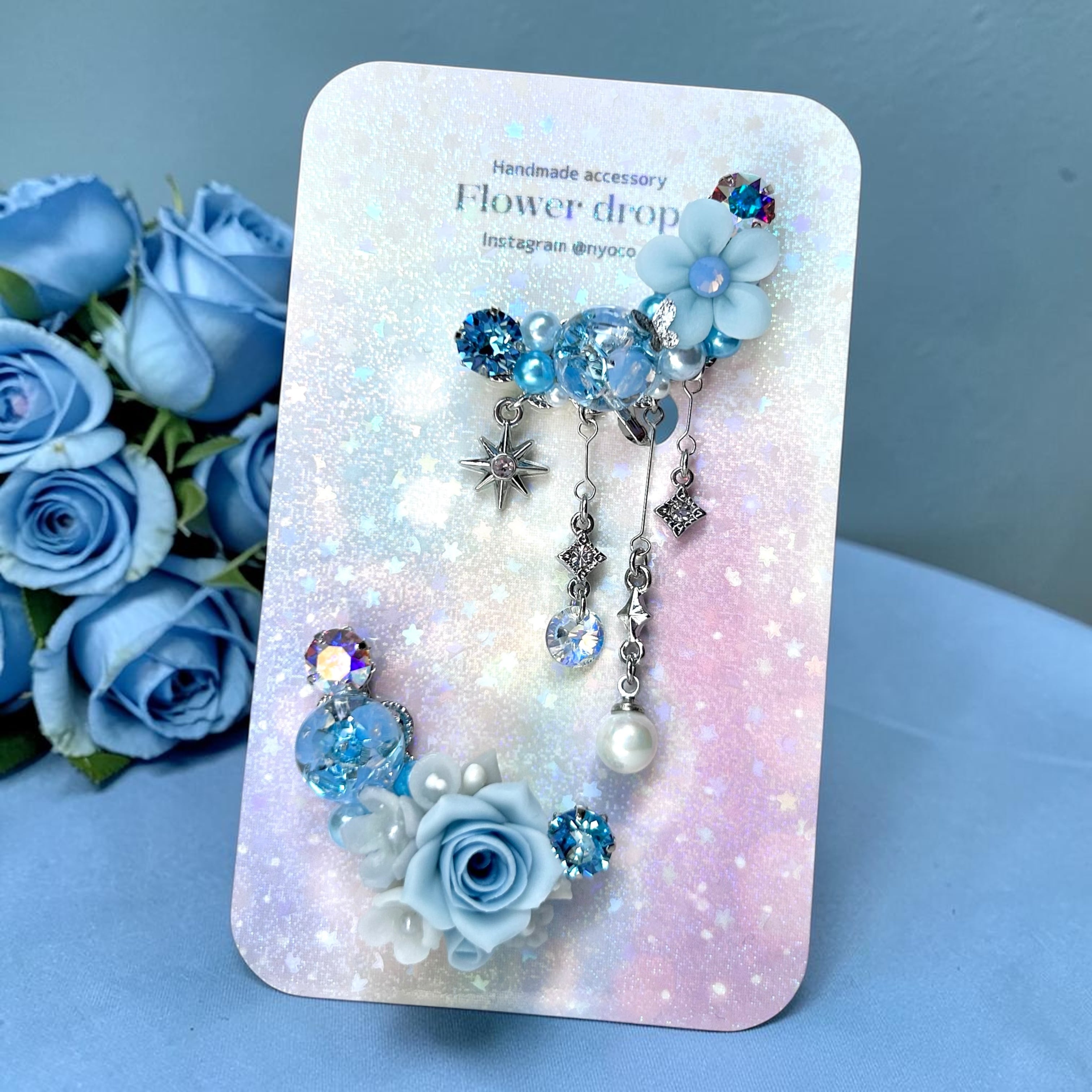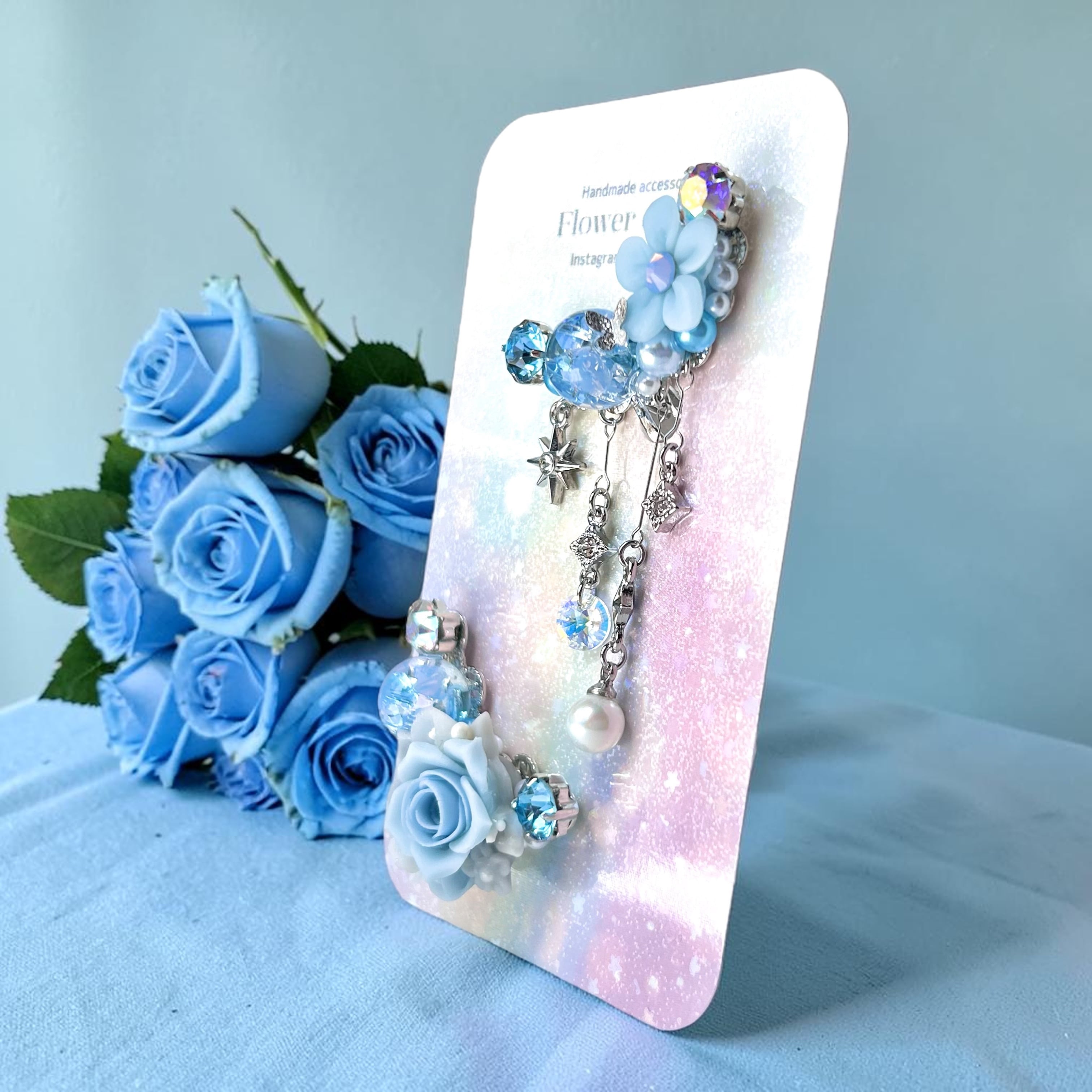 クリスタルドームビジュー♥クレイフラワーのイヤーカフ(ローズ/水色)