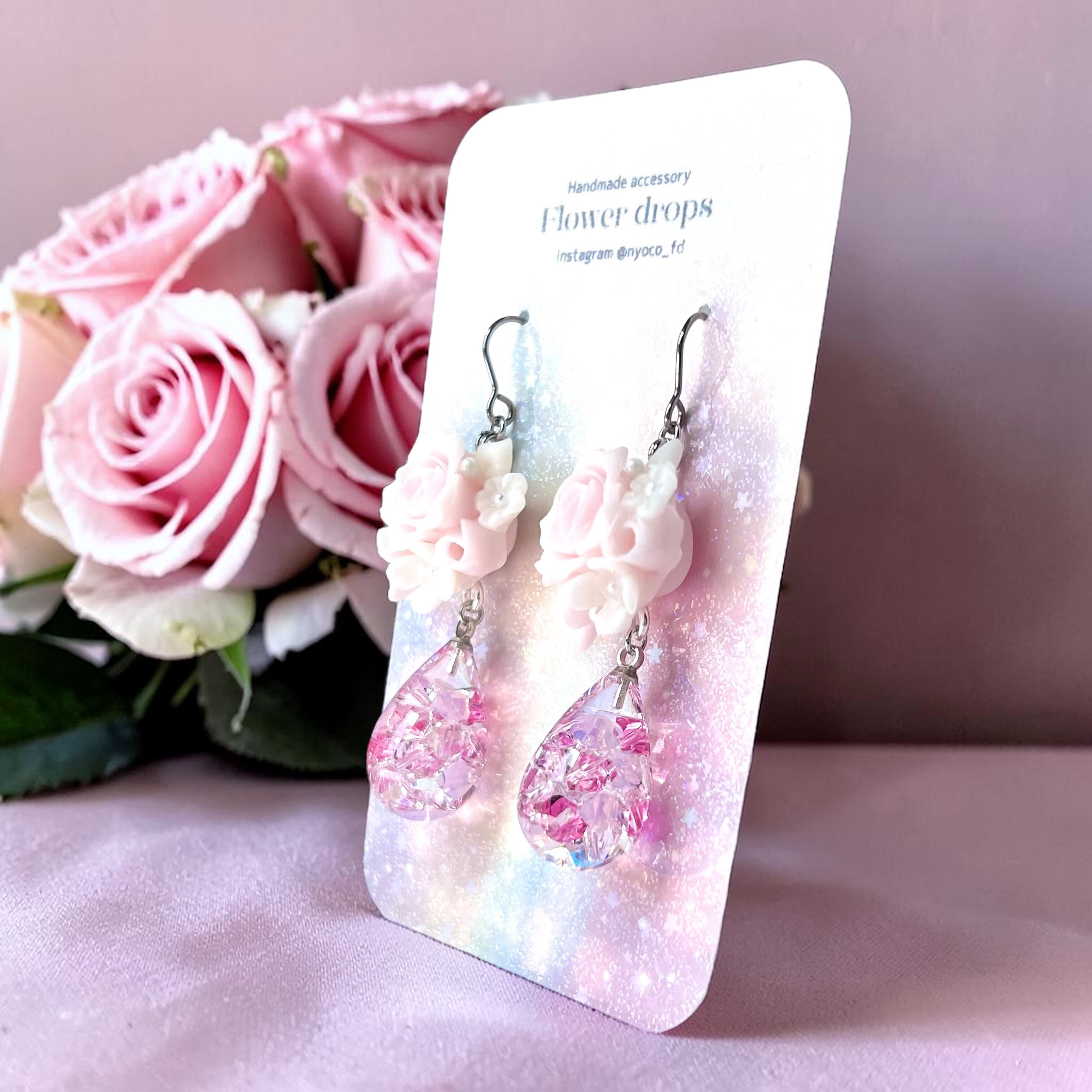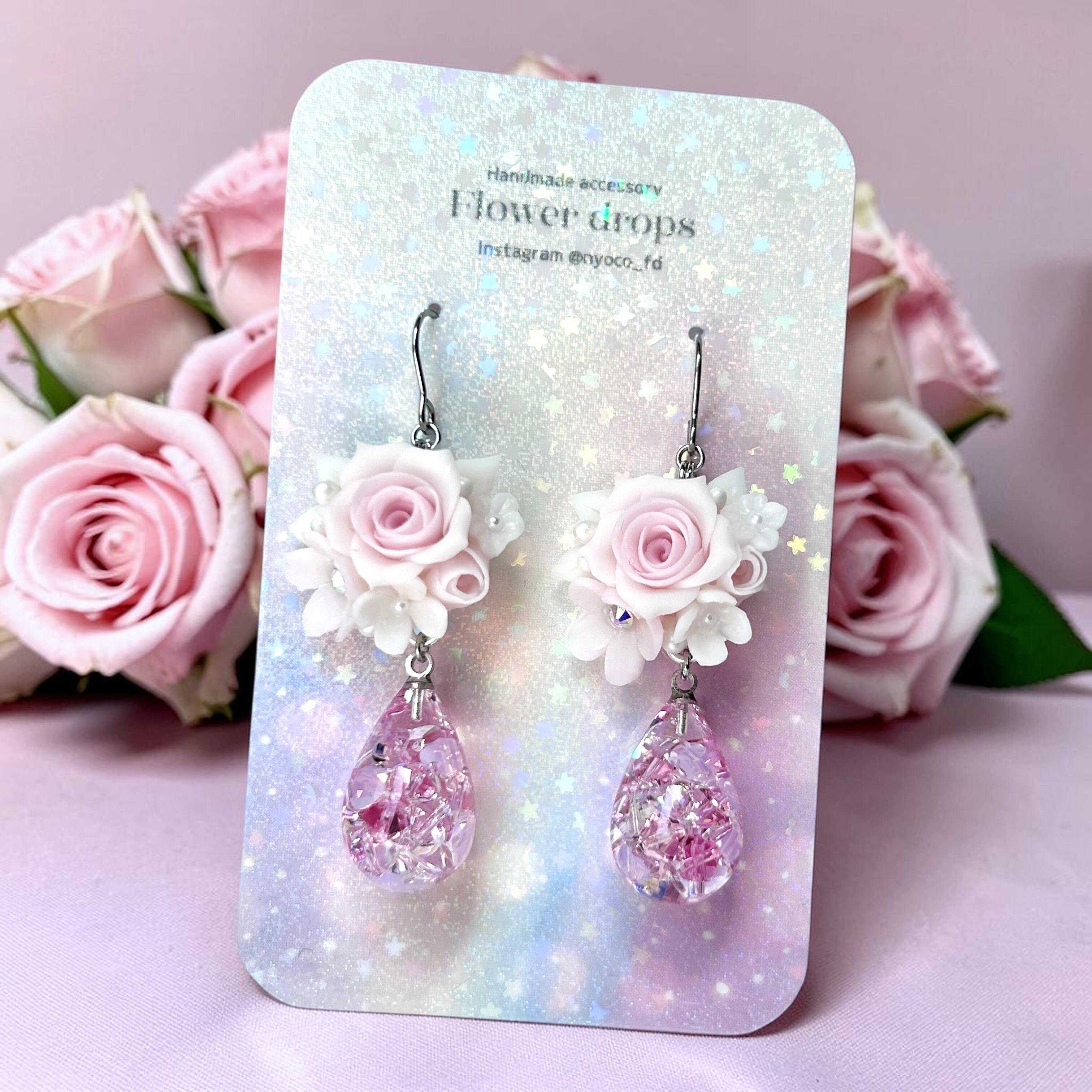 煌めくしずく♥クレイフラワーの耳飾り(ローズ/ピンク)